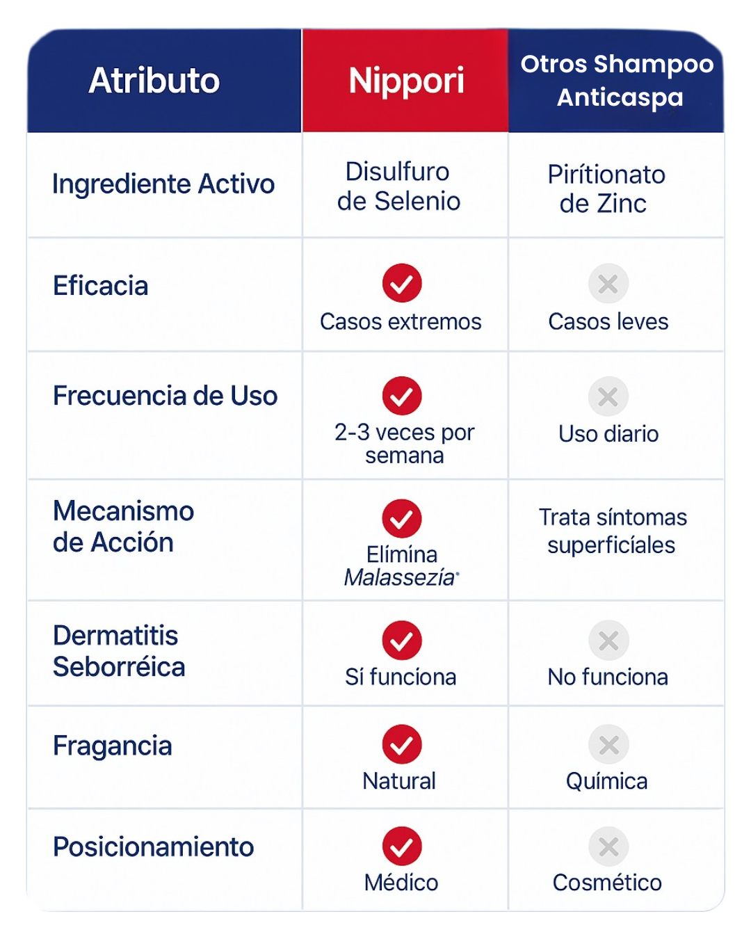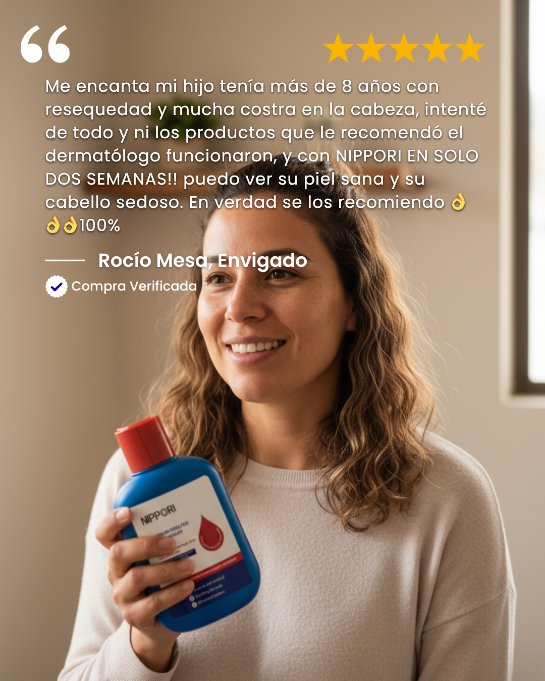 Mientras otros champús solo disfrazan los síntomas, Nippori ataca las 4 causas principales que arruinan la salud de tu cabello y tu confianza personal. Con Disulfuro de Selenio médico + Sal Marina, obtienes resultados que puedes ver y sentir desde el primer uso.